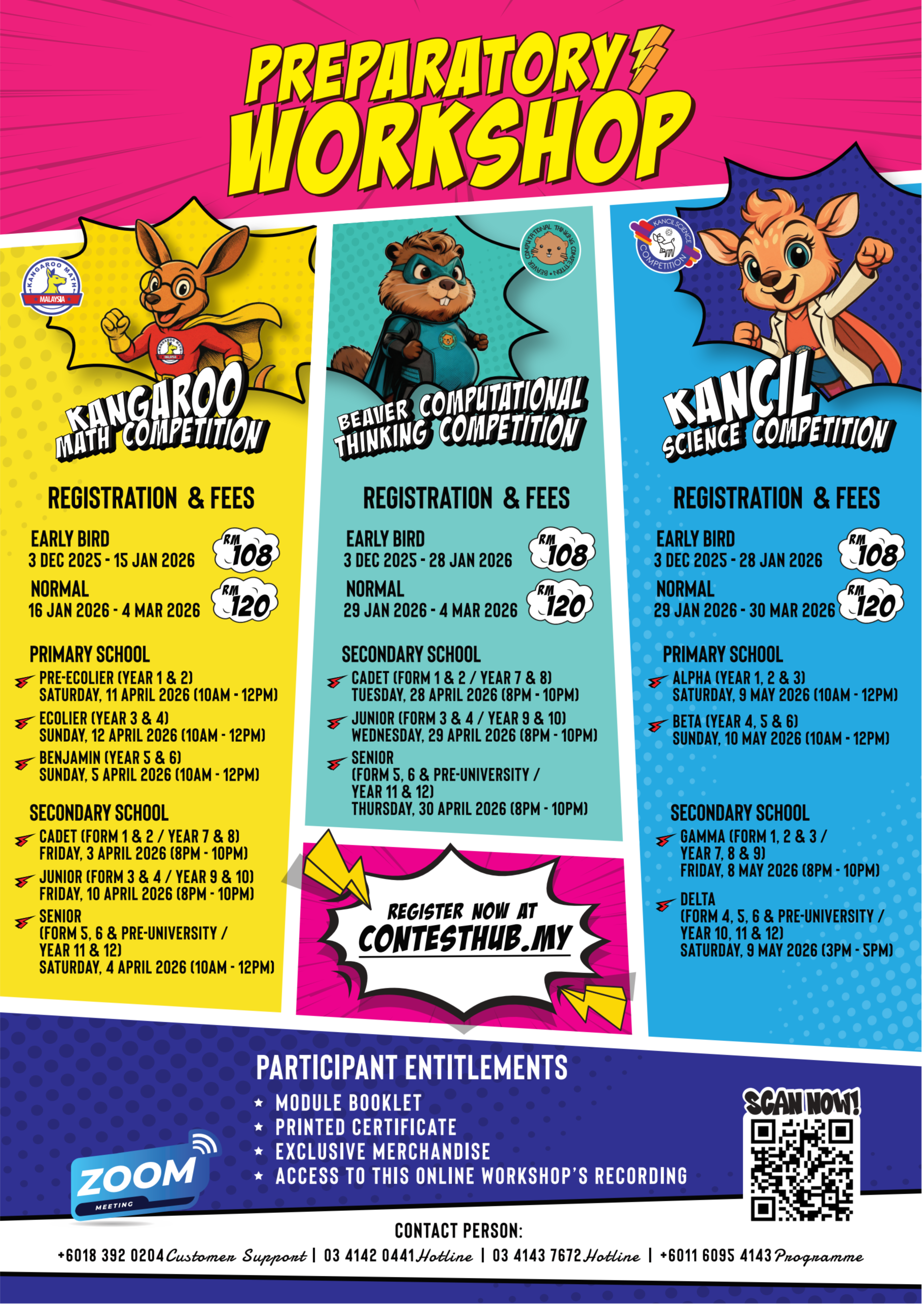 Join our Preparatory Workshop 2026, a comprehensive online programme designed to help students excel in the Kangaroo Math Competition, Beaver Computational Thinking Competition, and Kancil Science Competition. Open to both primary and secondary school students, this Zoom-based workshop offers structured practice, competition-style questions, and guided problem-solving aligned with each competition’s format and syllabus. Participants will receive a module booklet, printed certificate, exclusive merchandise, and access to the workshop recording. Early bird and normal registration options are available at RM108 and RM120 respectively, with sessions scheduled from April to May 2026 according to category and level. Register now at contesthub.my and boost your confidence and readiness for these national competitions.