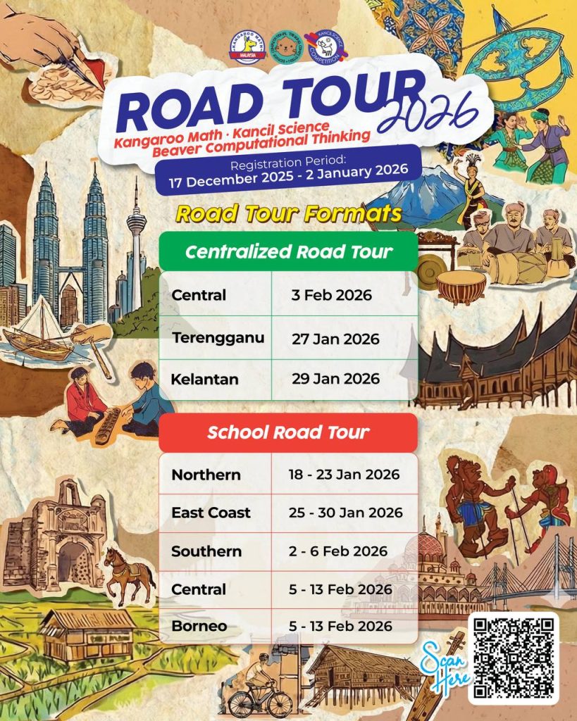 Road Tour 2026 comes in two exciting formats: the Centralized Road Tour (Teacher-Focused), where teachers from multiple schools gather at one venue to explore STEM sharing, competition flow, the Kangaroo Ambassador Programme, and registration insights; and the School Road Tour (Student-Focused), conducted right at your school, giving students hands-on exposure to competition-style questions, problem-solving techniques, and step-by-step contest guidance. Don’t miss this golden opportunity to learn, explore, and prepare together—👉 Register now at https://tinyurl.com/RoadTour2026 and see you at Road Tour 2026! 🚀